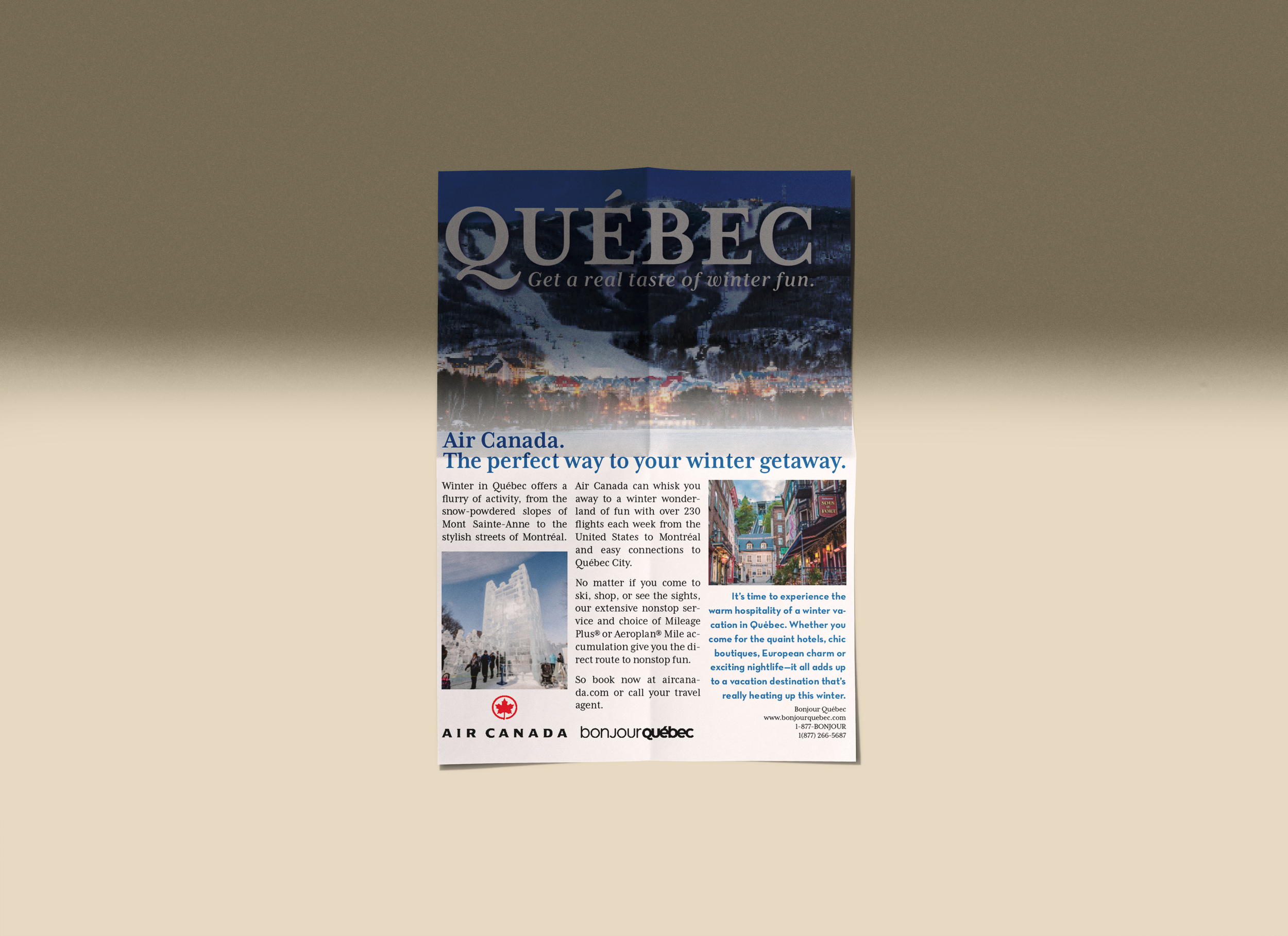 QUEBEC TRAVEL AD // QUEBEC TRAVEL AD // QUEBEC TRAVEL AD // Quebec Travel Ad:This was a school assignment for a fictional client, I was tasked with creating a travel ad for Quebec using the provided images and text.I used Adobe Indesign to create this piece.